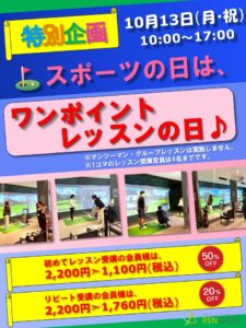 10月13日、スポーツの日は特別企画として能登谷コーチのワンポイントレッスンを特別価格でご提供します♪